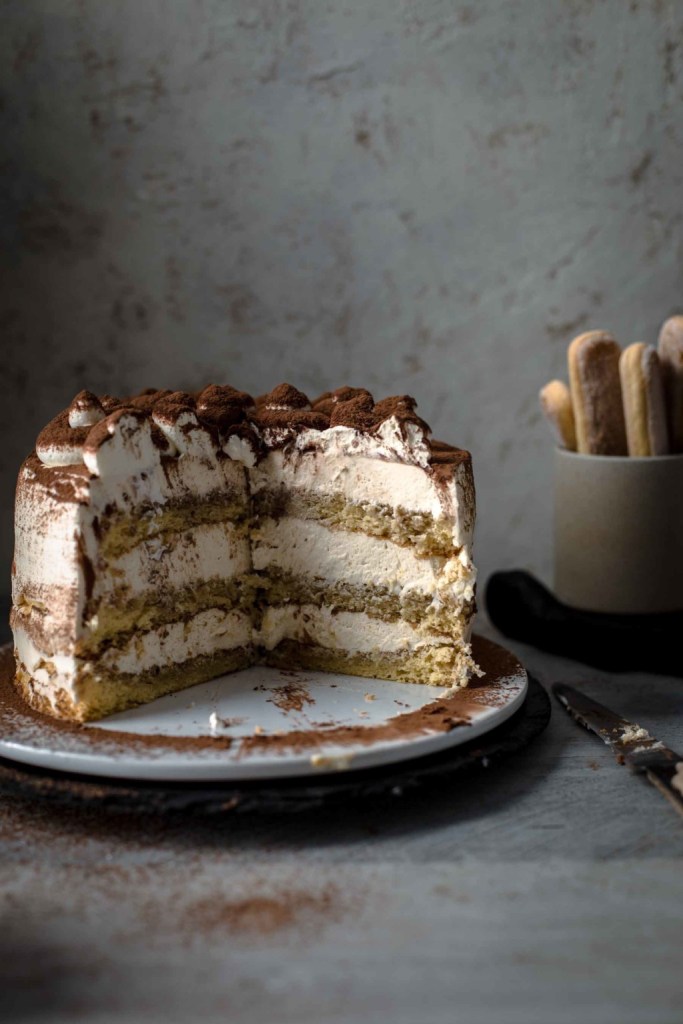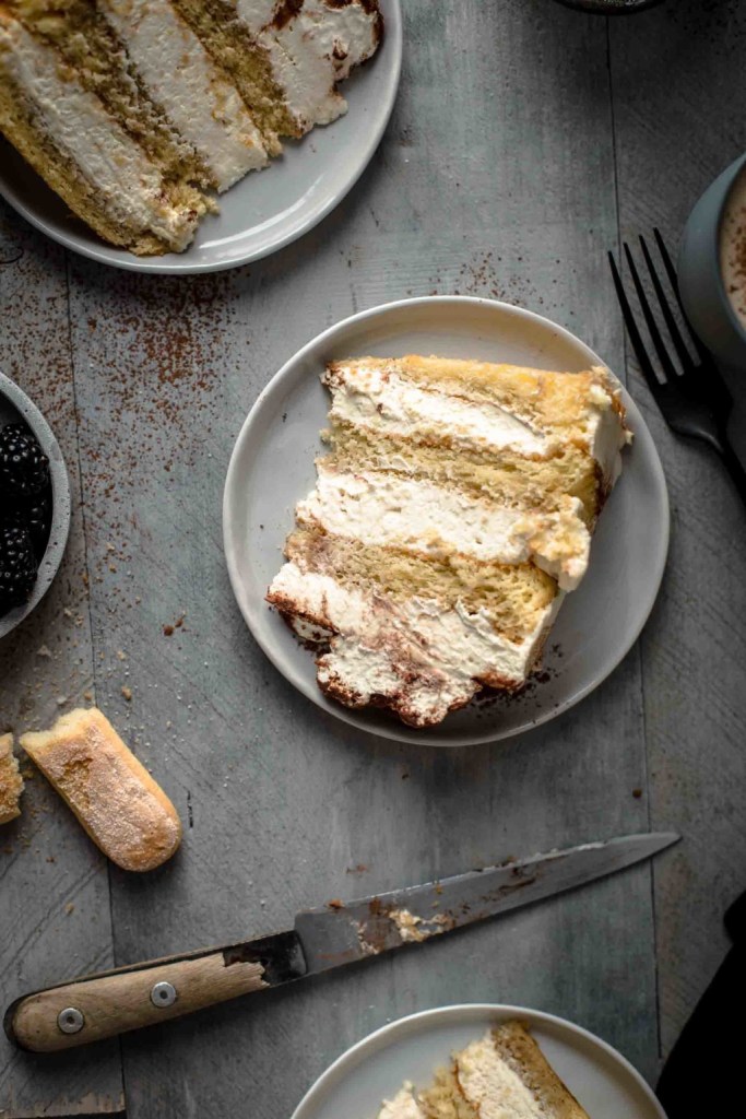 This Tiramisu Cake is made of genoise cake layers brushed with espresso and filled with irresistibly creamy coffee mascarpone cream. There are no raw eggs in the frosting and is therefore safe to eat. All you need are just 10 ingredients!